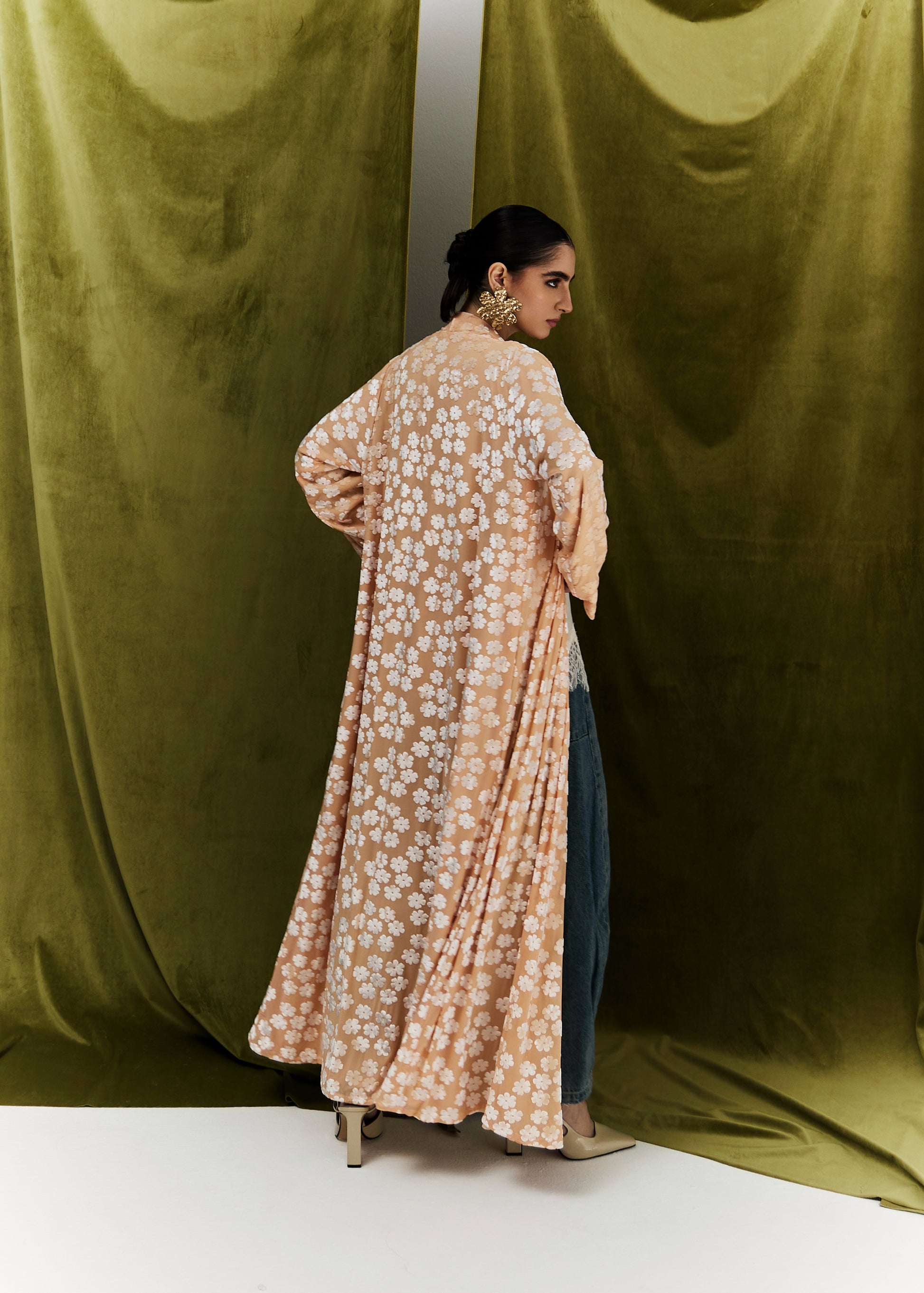 Flora is a delicate celebration of femininity and nature. Soft velvet flowers bloom across a dreamy palette of light peach and white, creating a piece that's both romantic and refined. The gentle color combination paired with intricate floral details brings an ethereal quality that feels effortlessly elegant.