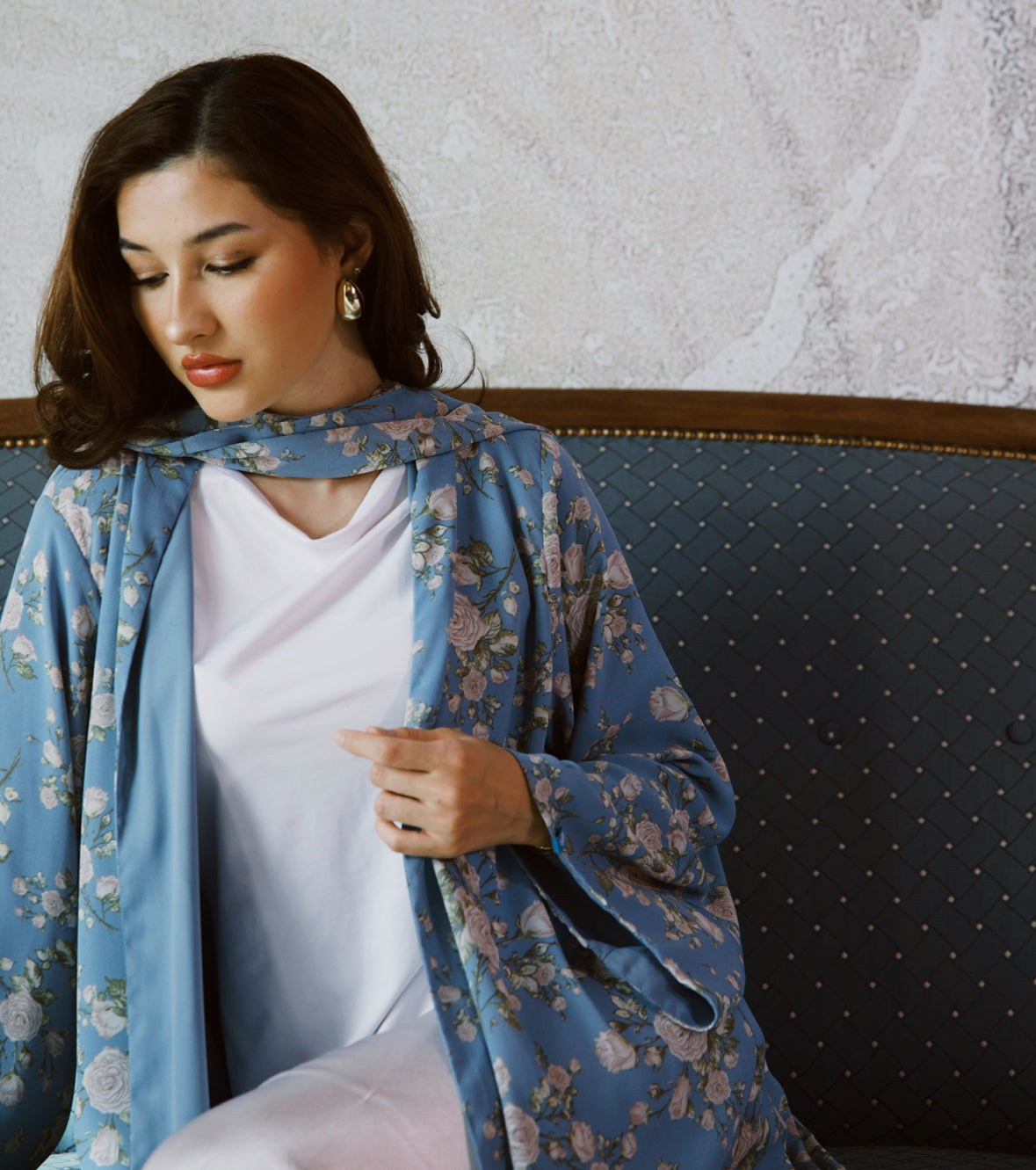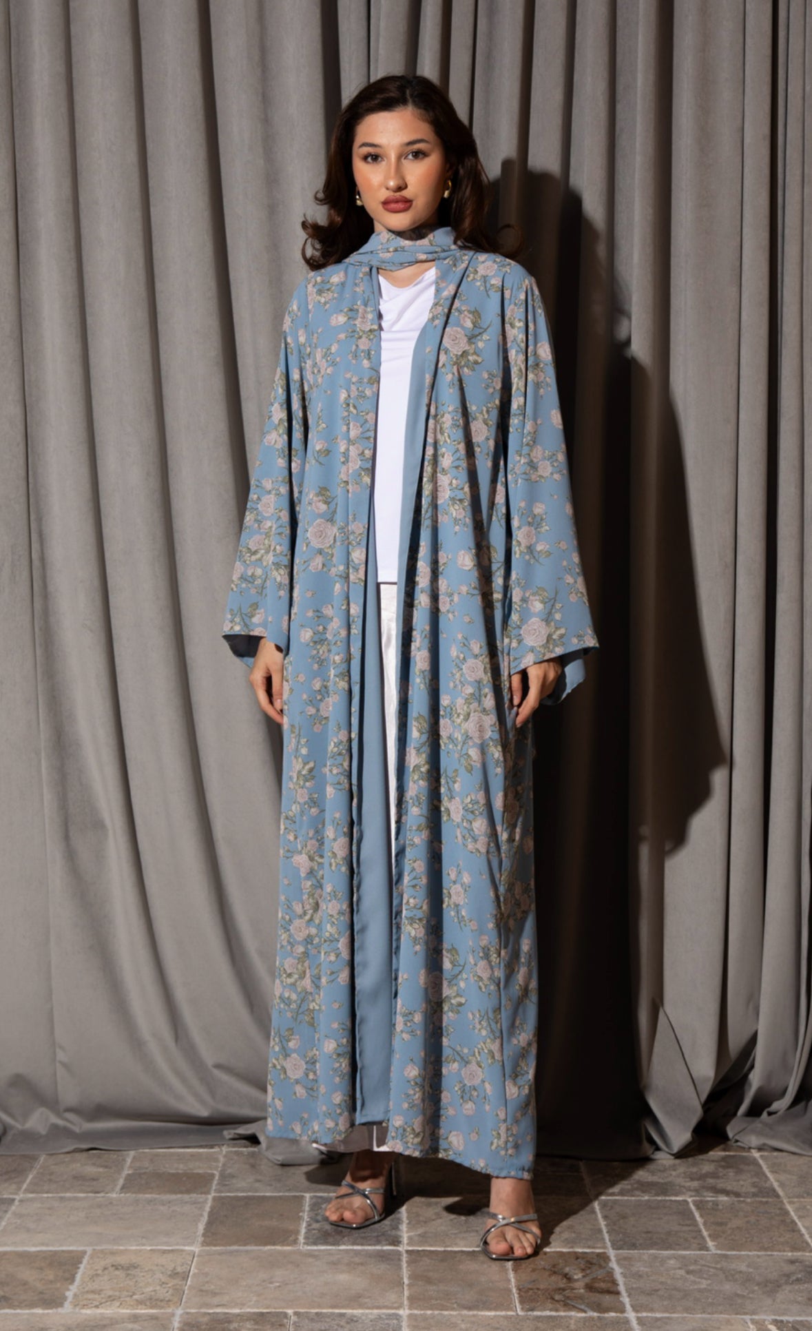 Double layer chiffon abaya with printed headscarf.