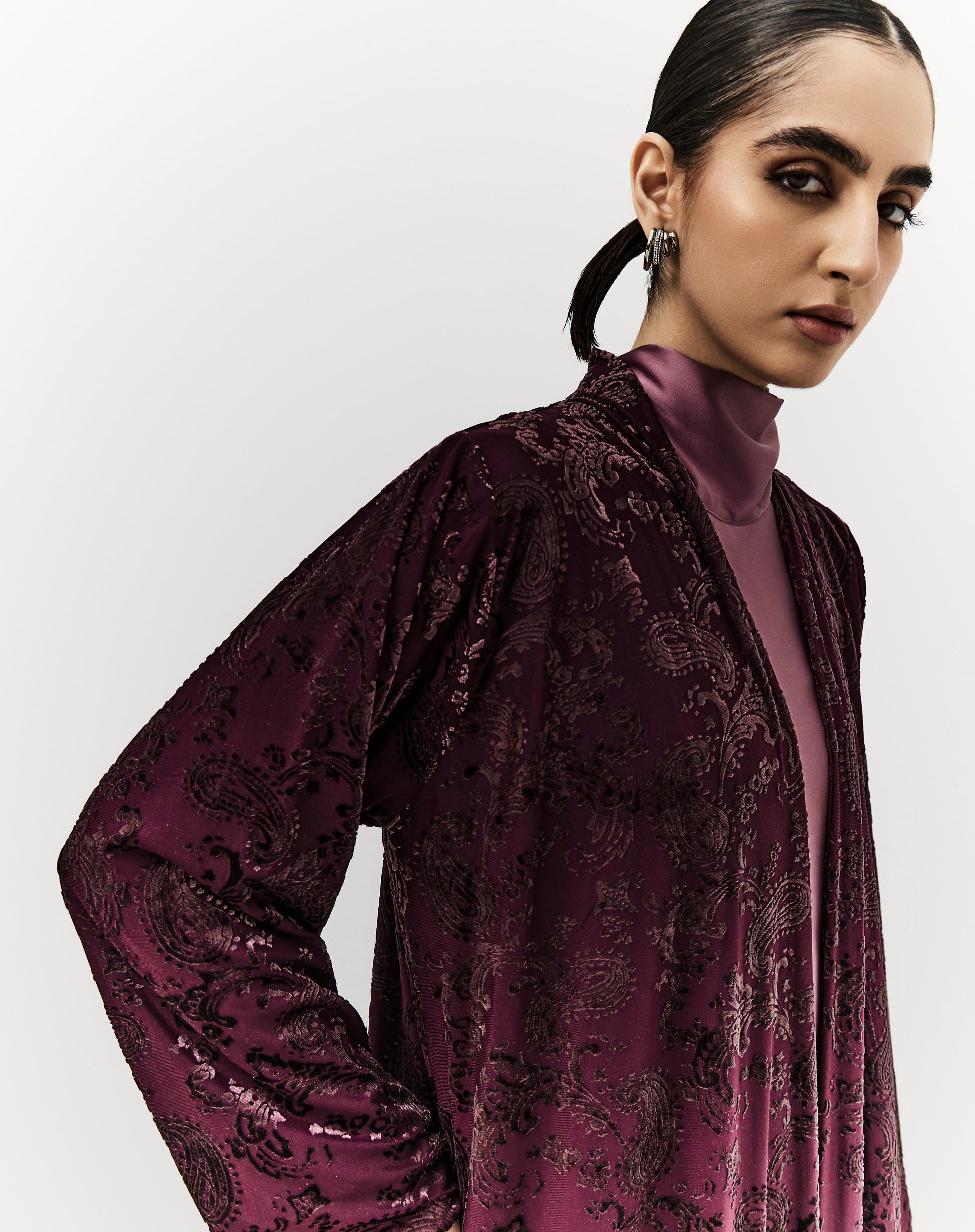 Taz is a stunning celebration of intricate design in rich mauve velvet. Delicate paisley patterns flow across the soft fabric, creating a piece that's both timeless and wonderfully distinctive. The combination of ornate details and smooth velvet texture brings sophistication and personality to your wardrobe. It's the kind of statement piece that makes every moment feel a little more special.