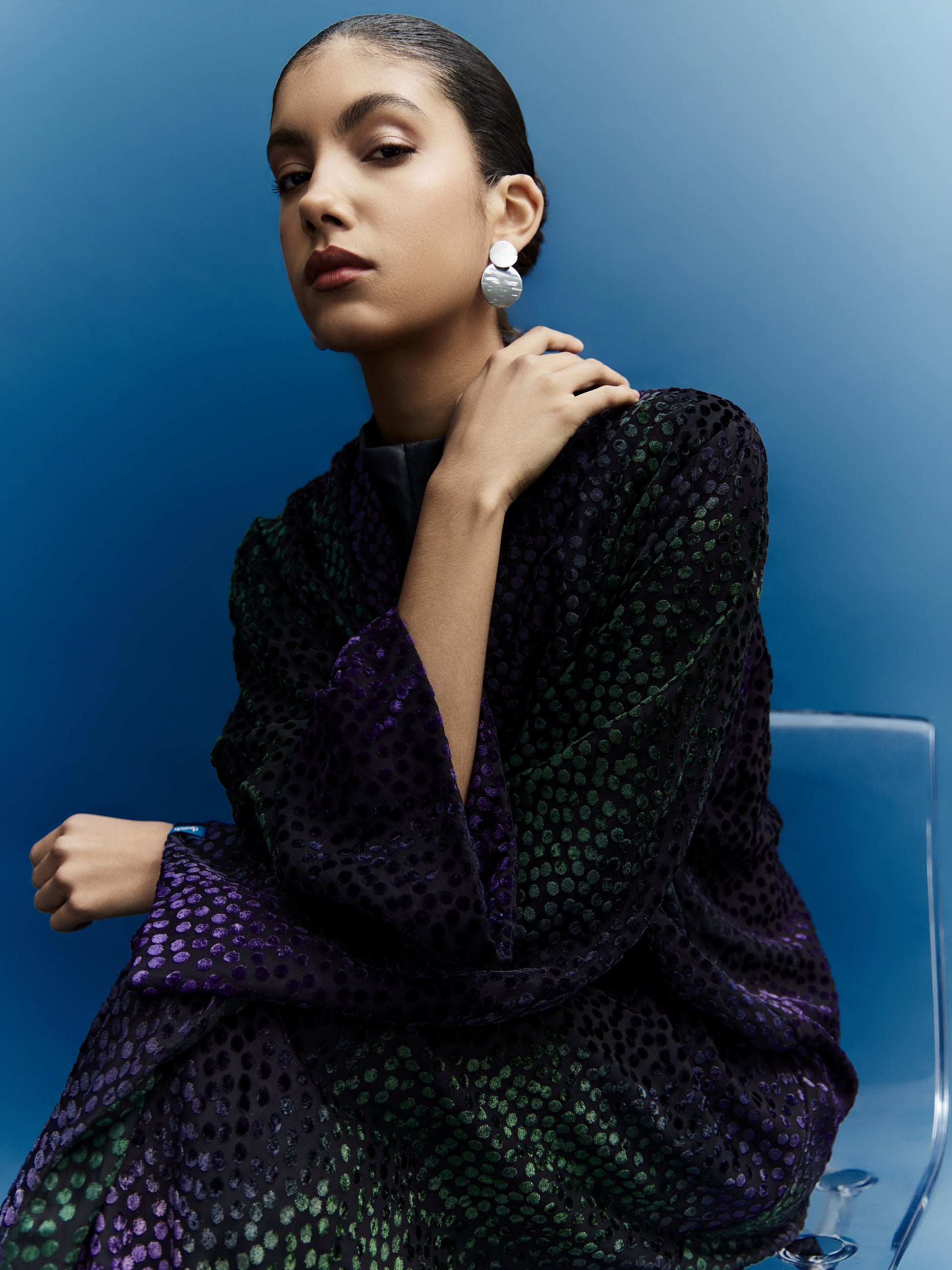 Velvet Dots is a mesmerizing blend of elegance and whimsy. Choose between classic black or mystique—a captivating fusion of purple and green hues. The delicate chiffon base is adorned with plush velvet dots that add texture and visual intrigue, while the soft chiffon lining ensures comfort throughout the day. It's the kind of piece that invites compliments and sparks conversation.